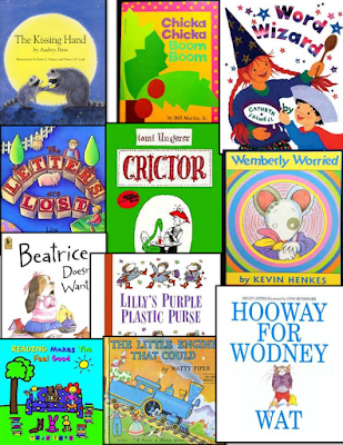 I like doing a Kevin Henkes Author Study at the beginning of the year. I have his picture and photos of books in my Author Study center. In the colored bins, I have all of his books and book buddies.